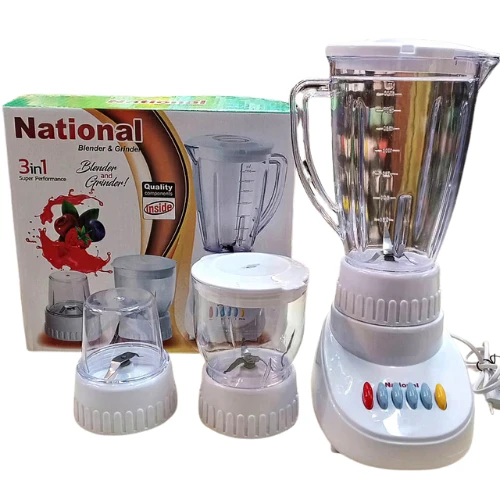 Upgrade your kitchen with the National 3‑in‑1 Juicer Blender Grinder, powered by a robust 1000 W motor and designed for wet and dry milling, blending & juicing. Whether it’s fresh fruit juices, smoothies, chutneys, or spice powders, this versatile appliance handles it all — making it perfect for daily cooking, meal prep, and traditional recipes. Equipped with multiple jars including a juicer jar, blender jar, and dry grinder (spice mill), plus stainless-steel blades and safety interlock, it ensures both performance and safety. The clear glass blending container is easy to clean and lets you monitor the contents.