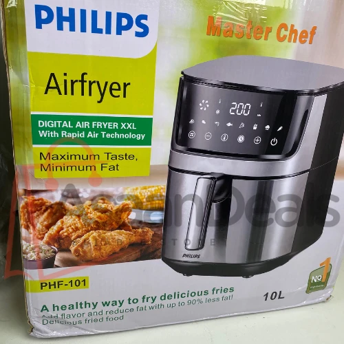 The Philips 10L Digital Air Fryer is designed for family-sized cooking with its extra-large 10L capacity, making it perfect for daily meals and gatherings. Using rapid hot air technology, it delivers crispy and delicious results with little to no oil, helping you enjoy healthier meals. Its digital touch control allows easy adjustment of temperature and timer settings, while the multi-function design lets you fry, bake, grill, roast, and reheat with one appliance. Faster than conventional ovens, this air fryer is both energy-efficient and time-saving. The removable non-stick basket makes cleaning simple and convenient, making it an ideal choice for healthy eating, low-fat cooking, and family-sized portions.