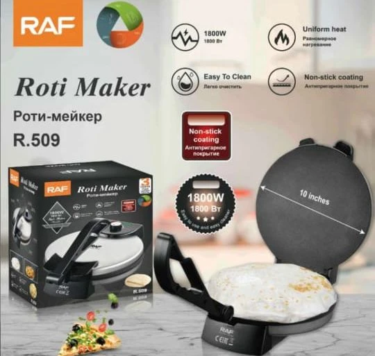 Elevate your kitchen routine with the RAF R‑509 Electric Roti Maker. This 10-inch model features a powerful 1800 W motor (operating at 220–240 V, 50 Hz) housed in sleek, cool-touch stainless steel, offering safety and durability. The double-sided non-stick plate ensures even, golden-brown chapatis, rotis, and parathas every time.
