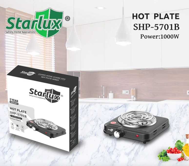 The Starlux 1000W Electric Hot Plate (Model SL‑5812) is a compact and reliable cooking companion for small kitchens, dorm rooms, offices, and outdoor use. With its 1,000-watt power output, this hot plate heats up in just 2 minutes, offering quick and even cooking performance. Its ceramic glass cooktop surface is durable, easy to clean, and scratch-resistant. Equipped with auto-thermostat temperature control and overheat protection, the hot plate automatically shuts off after 2 hours for enhanced safety.