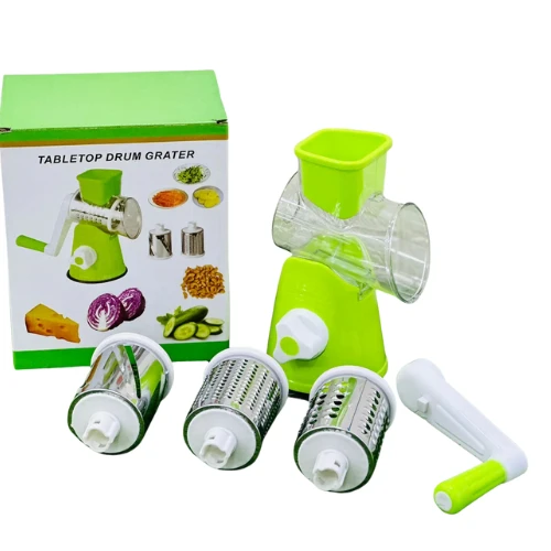 Say goodbye to tedious chopping! The Tabletop Drum Grater is a manual, rotary-style kitchen tool designed to grate, slice, and shred vegetables, cheese, dry fruits, and more — all in seconds. With 3 interchangeable stainless steel drums, it's perfect for preparing salads, garnishes, or even crushing nuts and chocolate. The strong suction base keeps it firmly in place, while the hand crank mechanism makes it effortless to use. Compact, durable, and easy to clean — a must-have for every modern kitchen!