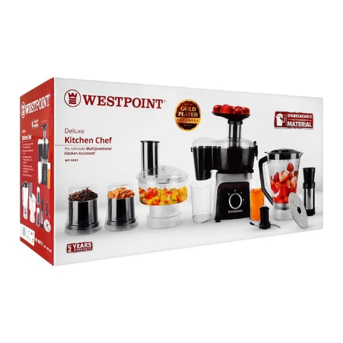 Upgrade your kitchen with the WestPoint WF-3804 Kitchen Chef, a 12-in-1 multifunction appliance designed for convenience and versatility. This powerful machine combines juicer, blender, dry mill, wet mill, meat mincer, chopper, slicer, shredder, kneader, and grinder – all in one compact design.